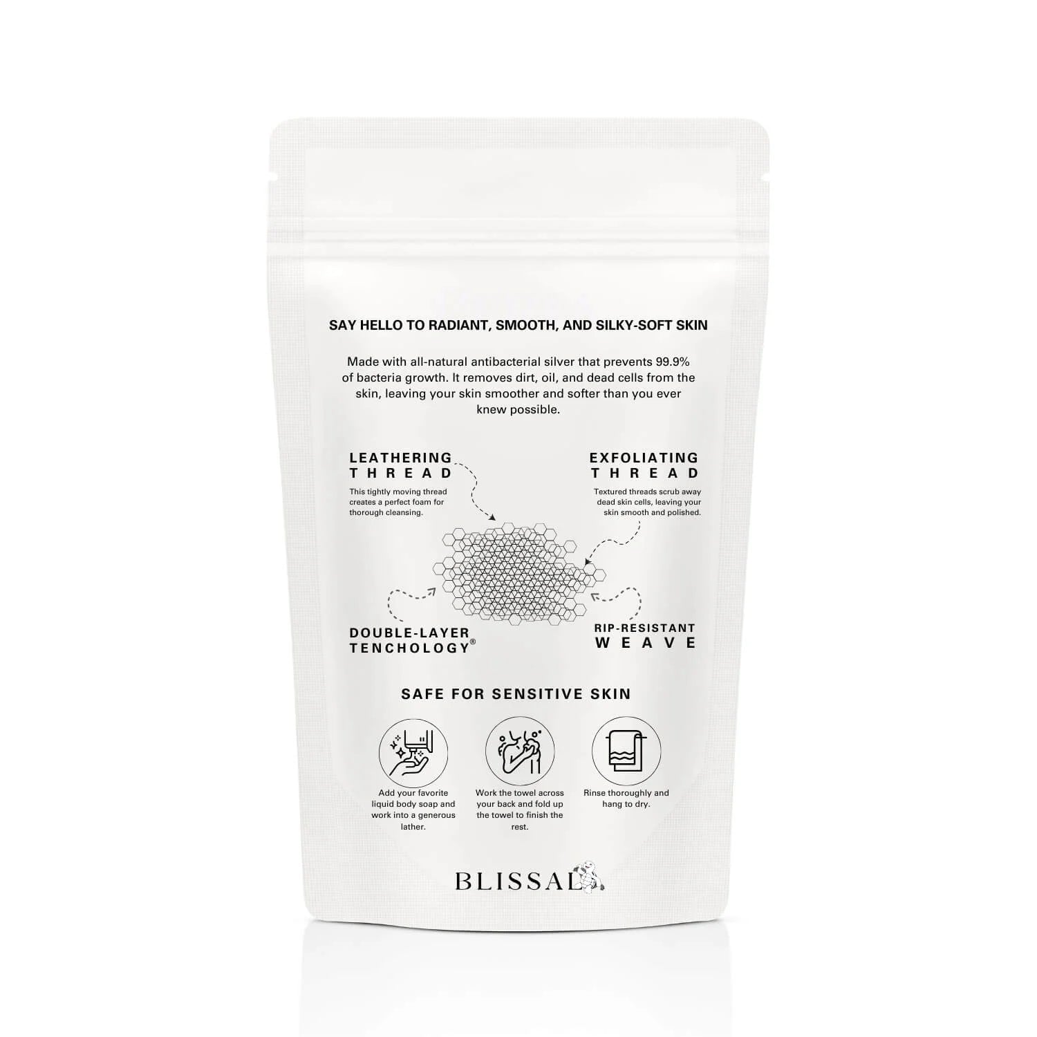 %99,9 saf gümüş iyonlarıile enfekte edilen Blissal, bakteri birikmesini ve hoş olmayan kokuları önler—böylece piyasadaki en temiz peeling havlusudur.